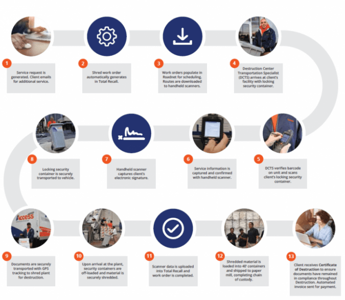 - Client receives Certificate of Destruction to ensure documents have remained in compliance throughout destruction. Automated invoice sent for payment.